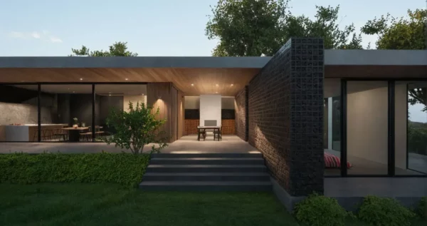 The Gabion CoolHouse is a modern two-bedroom, two-bathroom home designed around large gabion walls.
